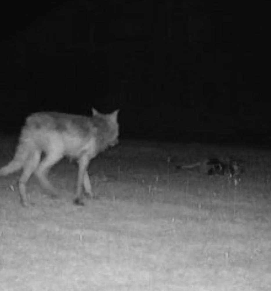 A wolf approaches a dead sheep near Lostine, Ore., on June 11, 2024. Lostine had six confirmed wolf depredations in 2024. Photo Credit: Kevin Harlander.