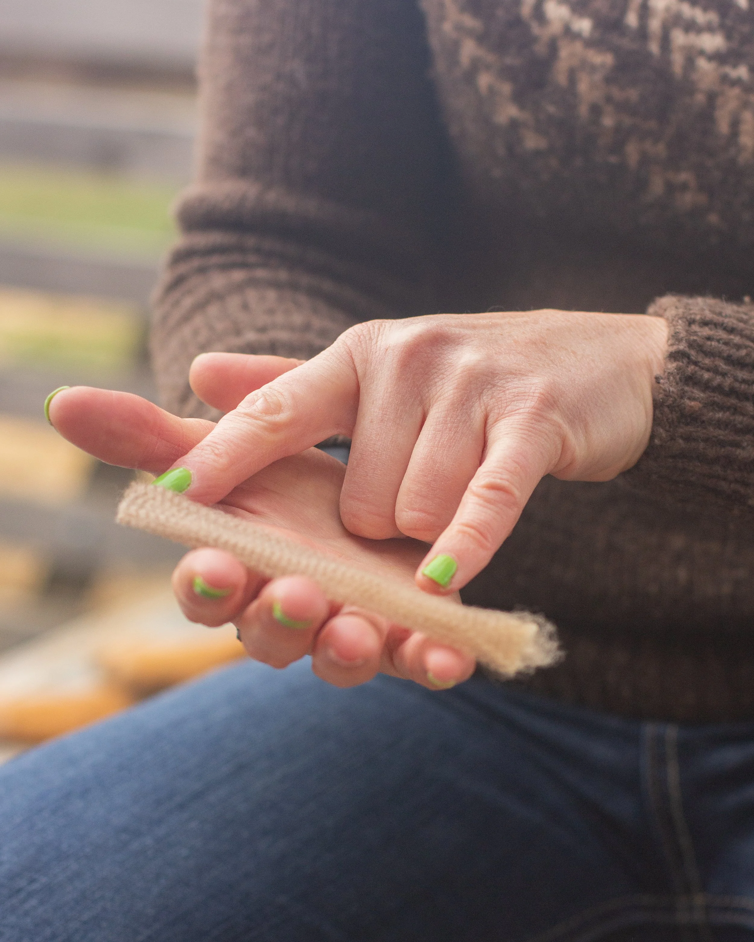 Stone demonstrates the texture of a raw wool sample, fresh from the flock.