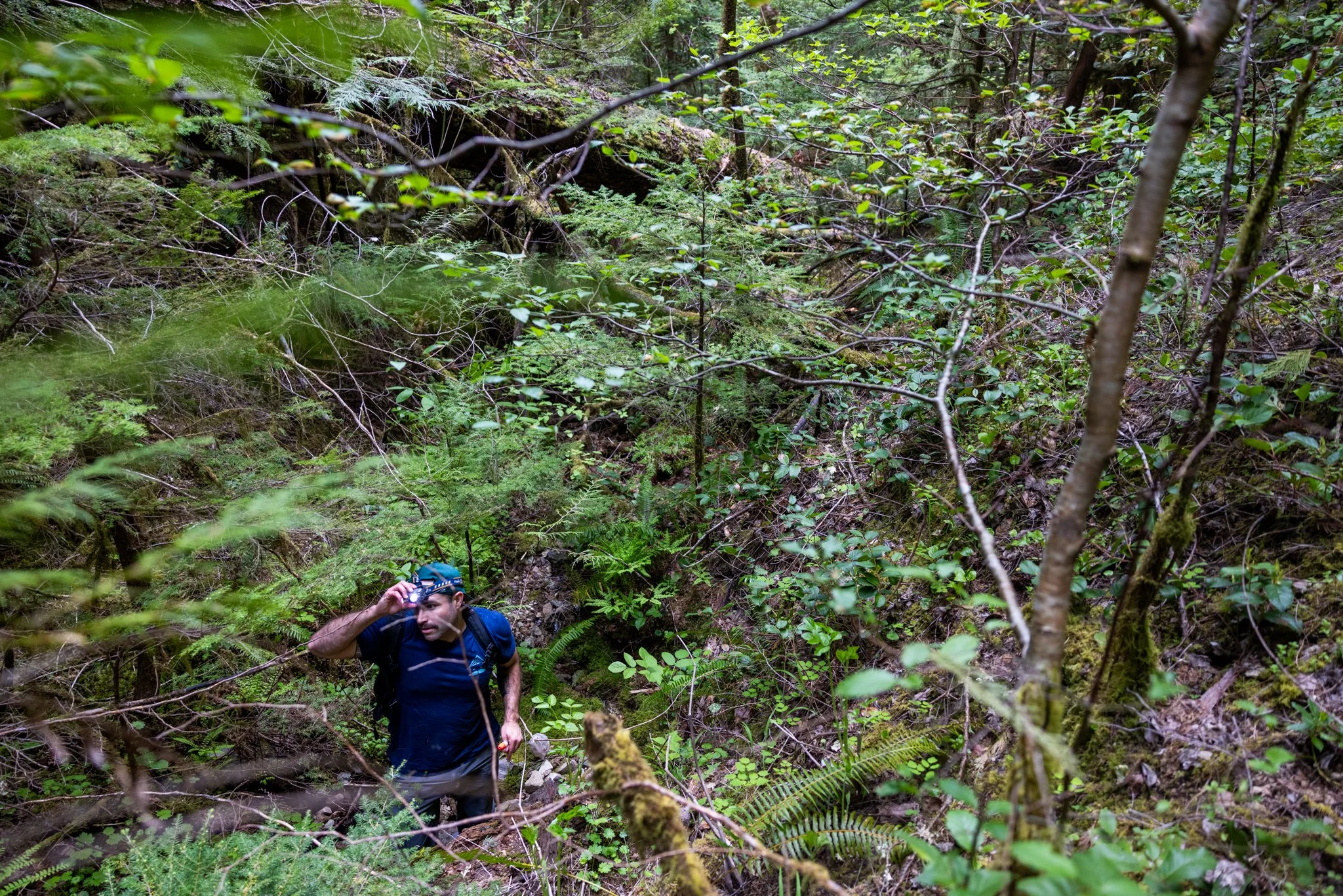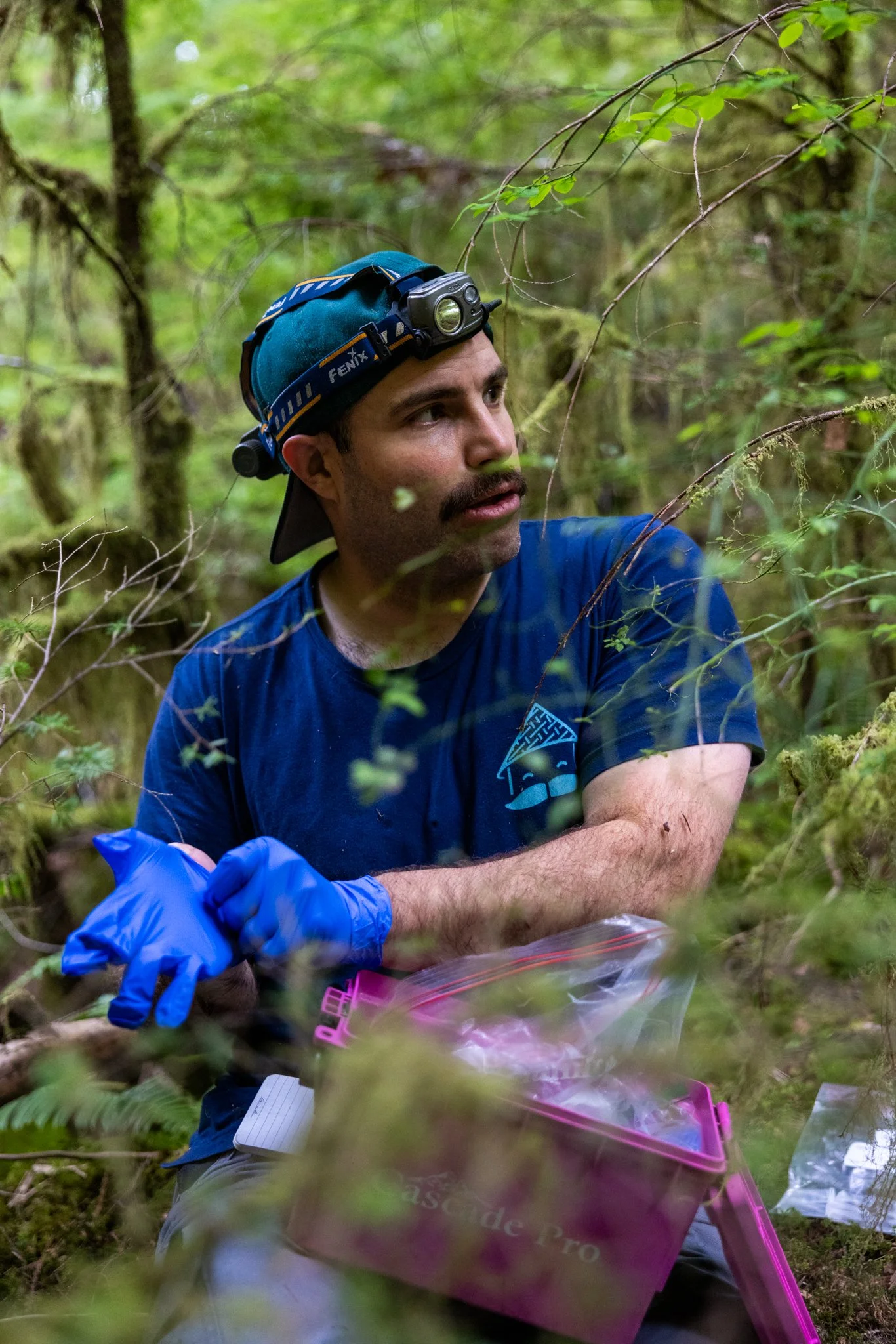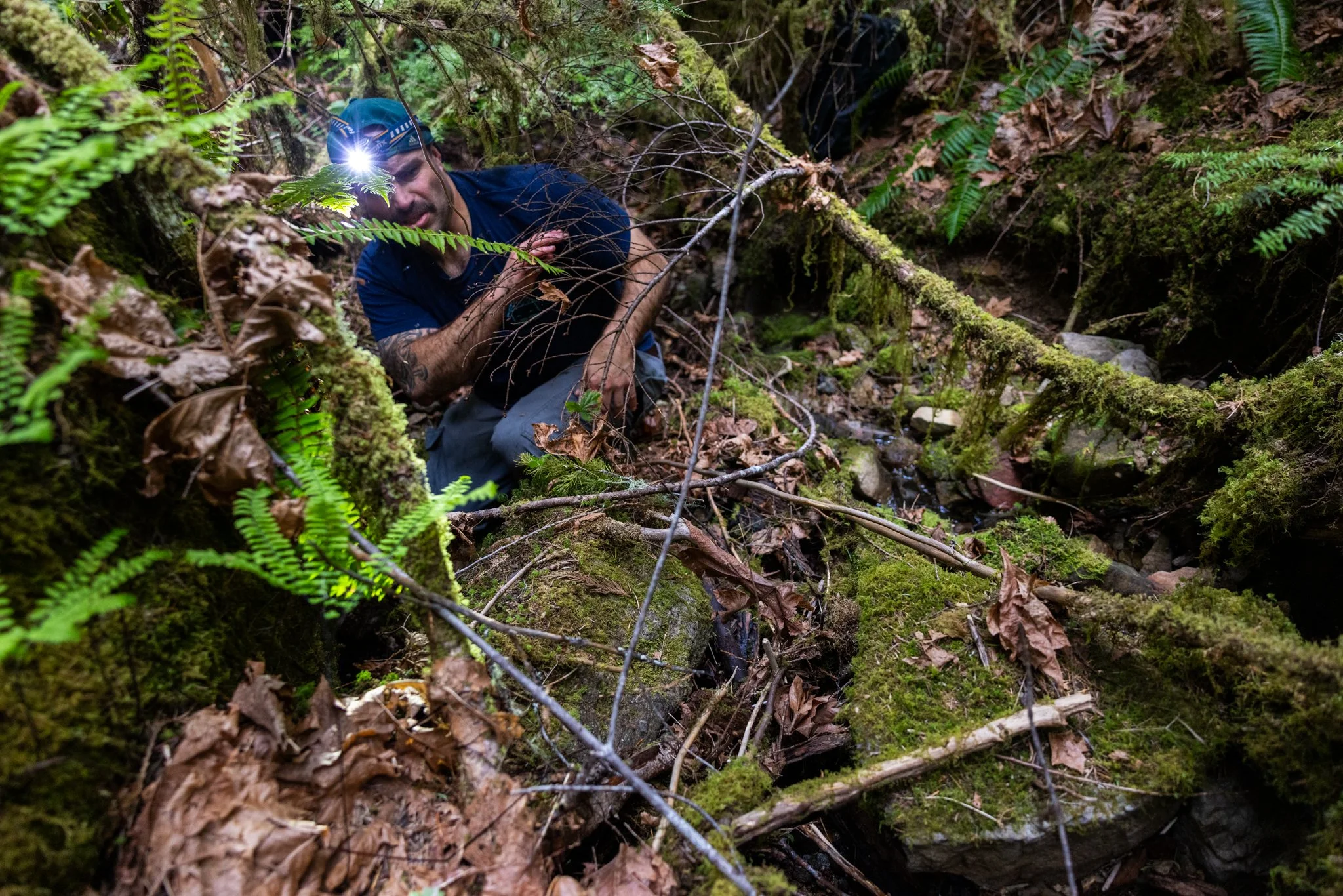 Chris Cousins, PhD candidate in the department of fish, wildlife and conservation sciences at Oregon State University, navigates a stream bed in search of cascade torrent salamanders in the H.J. Andrews Experimental Forest near Blue River, Oregon, May 7, 2025. Cousins is conducting a study to determine if the salamander should be listed as a federally endangered species, potentially increasing logging protections.